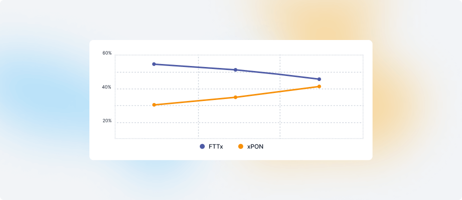 За даними річного звіту НКЕК за 2023 рік видно, що кількість точок підключення по технології PON зросла на 11% до 3,33 млн одиниць за попередні 2 роки, а по технології сімейства FTTx зменшилась на 7,2% до 3,77 млн точок підключення. Суттєві зміни відбулись протягом 2023 року.